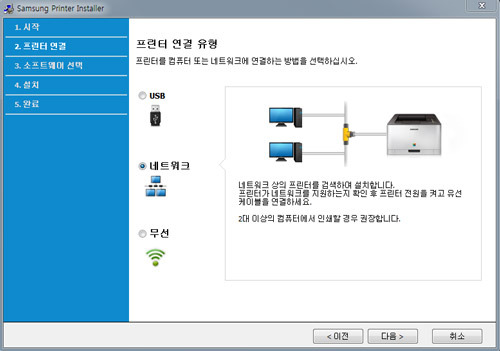 각 연결 방법에서 프린터와 컴퓨터 간의 연결상태를 확인하며 진행하면 됩니다.