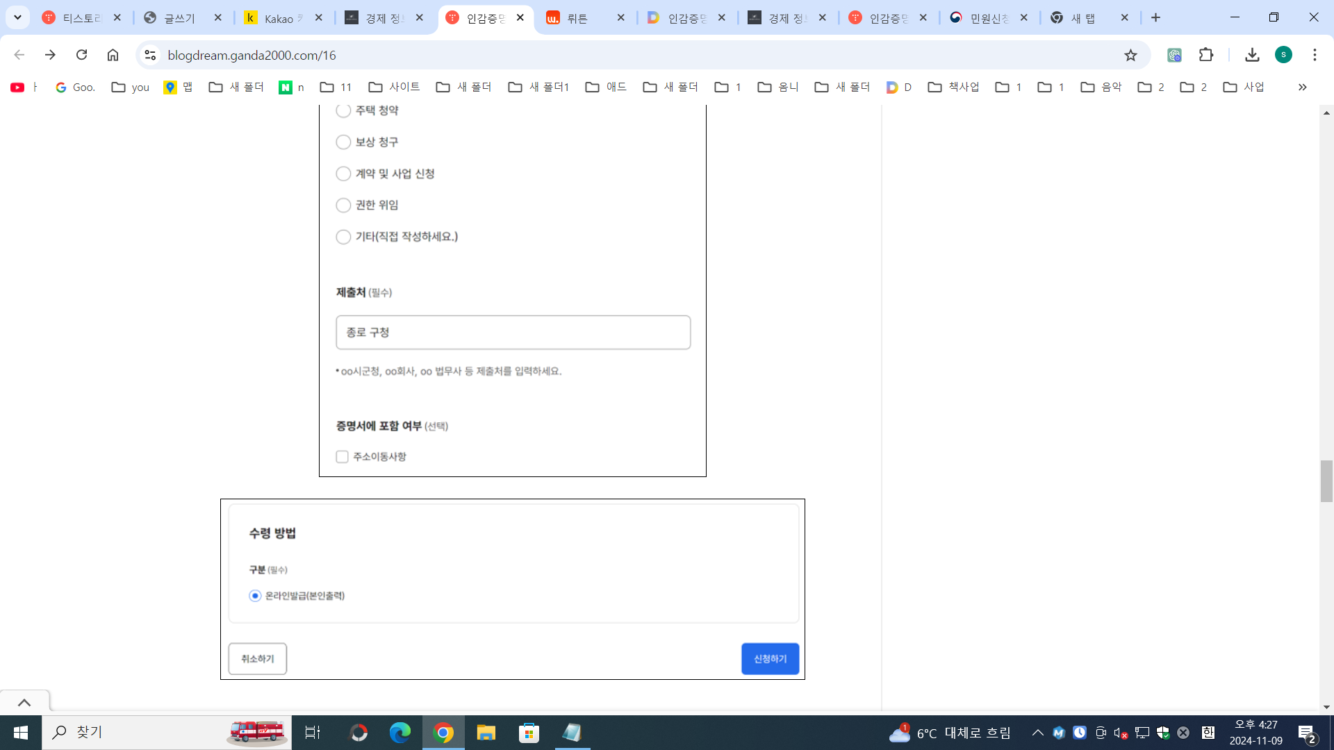 - 정보 입력: 필요한 정보(발급 용도, 제출처 등)를 정확하게 입력합니다.