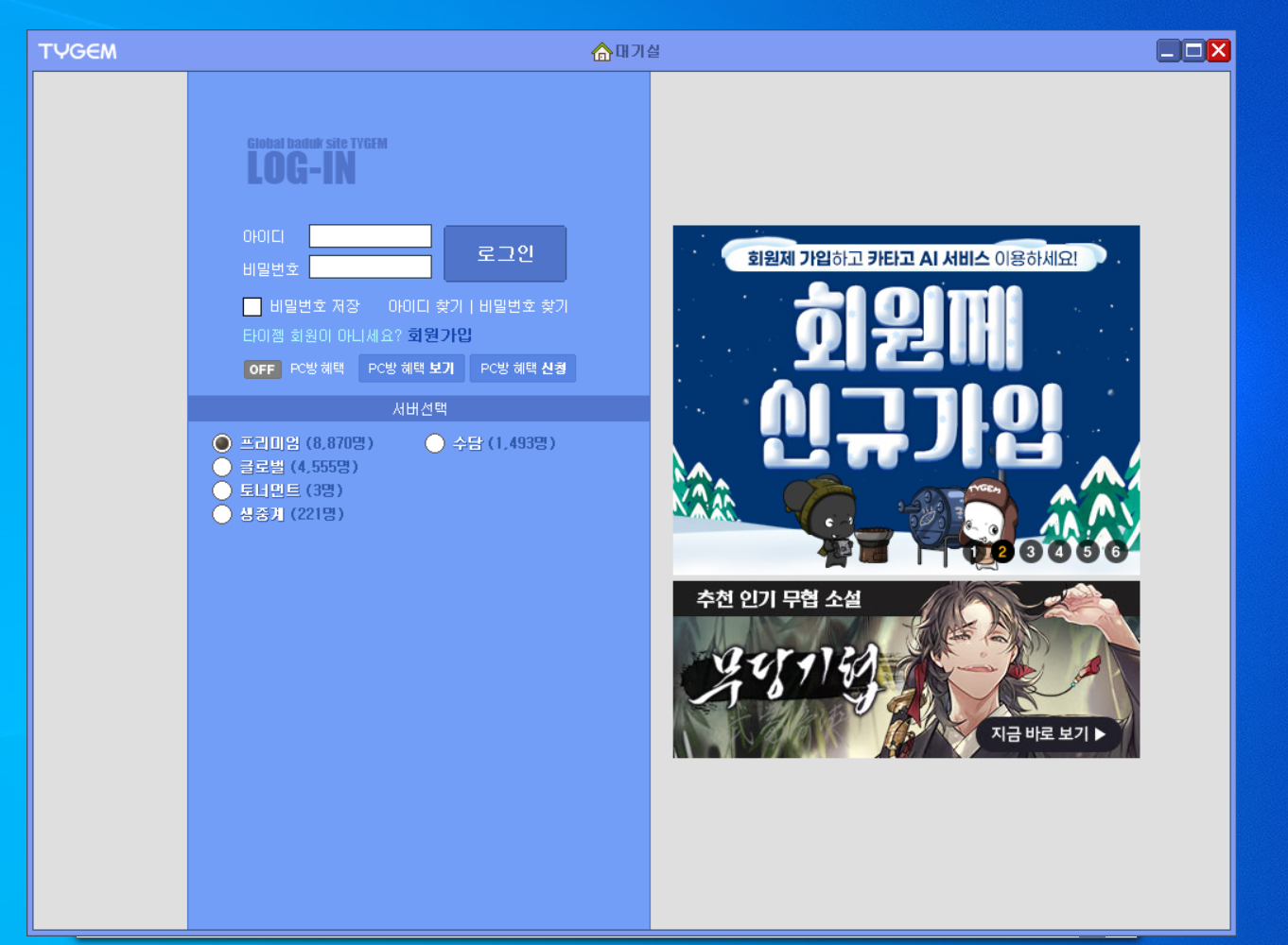 바탕화면의 "타이젬 바둑 대국실" 아이콘을 선택하여 프로그램을 실행합니다. 로그인 창이 나타나면 회원가입 시 사용한 아이디와 비밀번호를 입력하여 로그인합니다