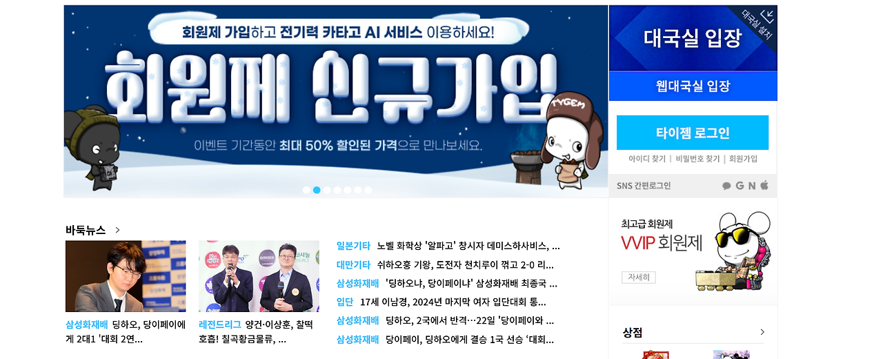 로그인 후, 홈페이지 메인 화면에서 "대국실 입장" 배너를 찾습니다. 배너 우측 하단에 있는 "대국실 다운로드" 버튼을 선택합니다. 이렇게 하면 "TygemBadukSetup.exe" 파일이 다운로드됩니다