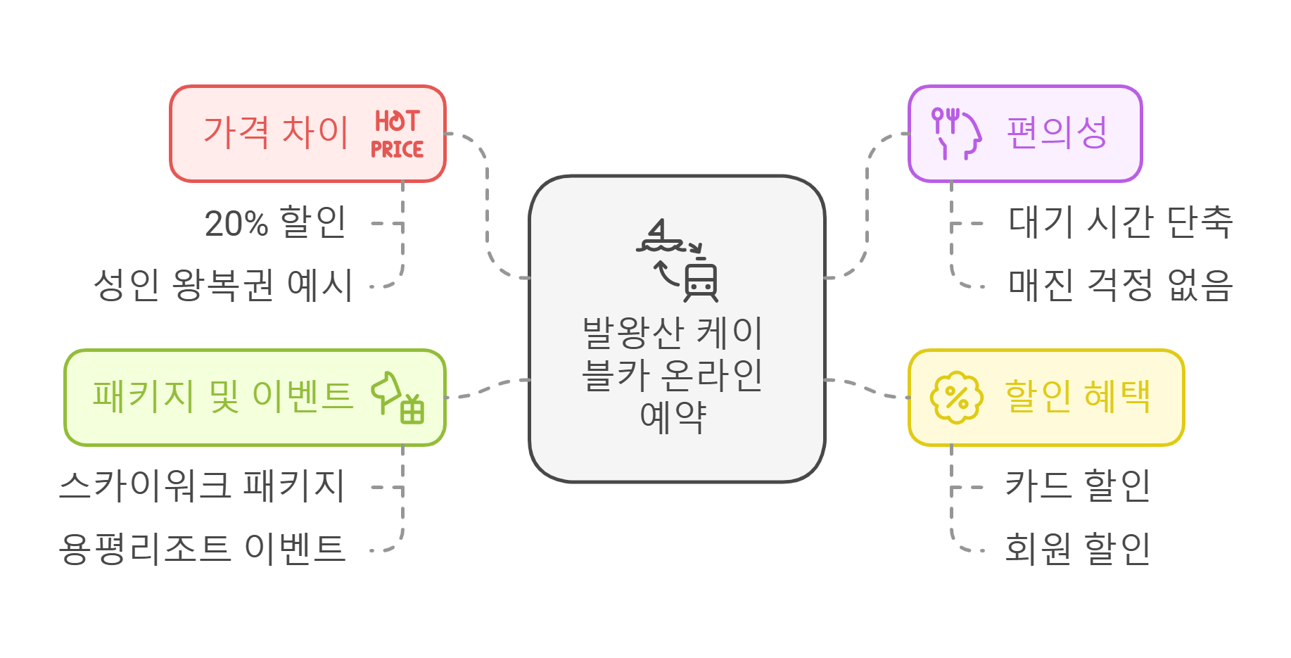 발왕산 케이블카 예약 시 온라인과 현장 구매에는 몇 가지 중요한 차이점이 있습니다: