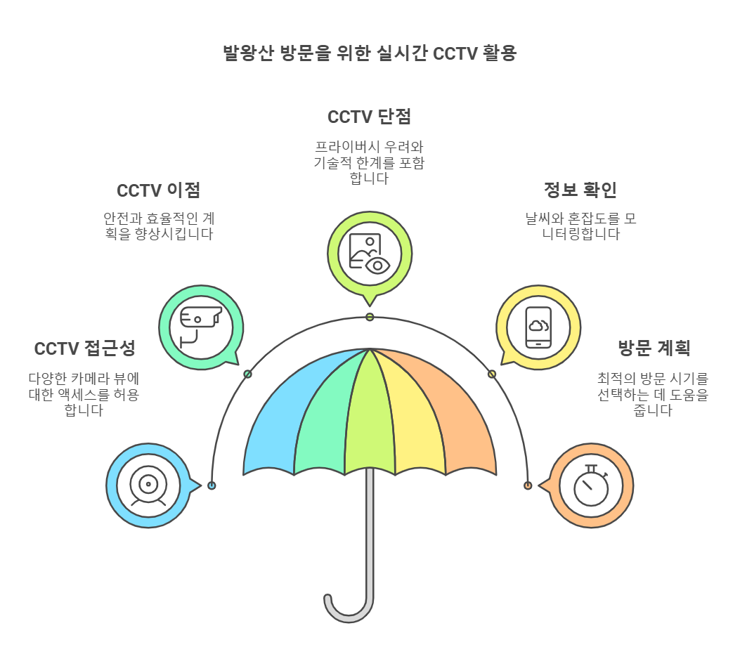 CCTV를 통해 확인한 정보를 바탕으로 여러분의 방문 목적에 가장 적합한 시기를 선택하세요. 예를 들어, 스카이워크에서의 전망을 즐기고 싶다면 맑은 날을 골라 방문하는 것이 좋습니다.