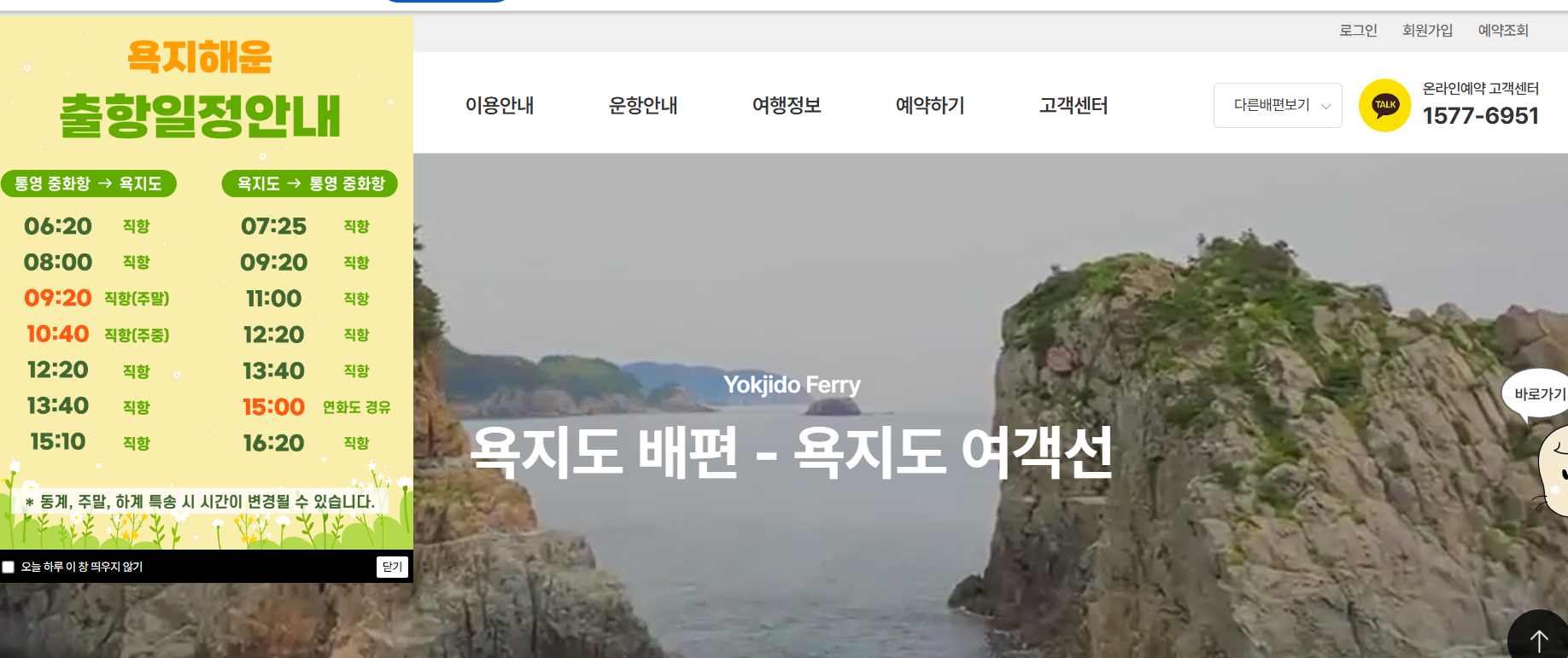 '욕지도 예약하기'를 선택하고 회원 또는 비회원으로 예매를 진행하세요.