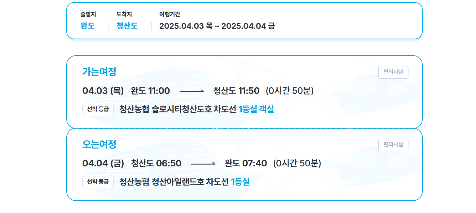 완도에서 청산도로 가는 배편은 하루 6회 운항하며, 배 소요시간은 약 50분입니다. 아래는 주요 시간표입니다: