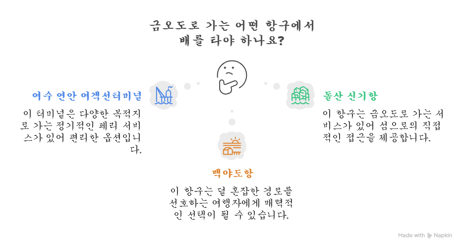 각 항구마다 운항 노선과 소요 시간이 다르므로, 여행 일정과 목적에 맞는 선택이 필요합니다.