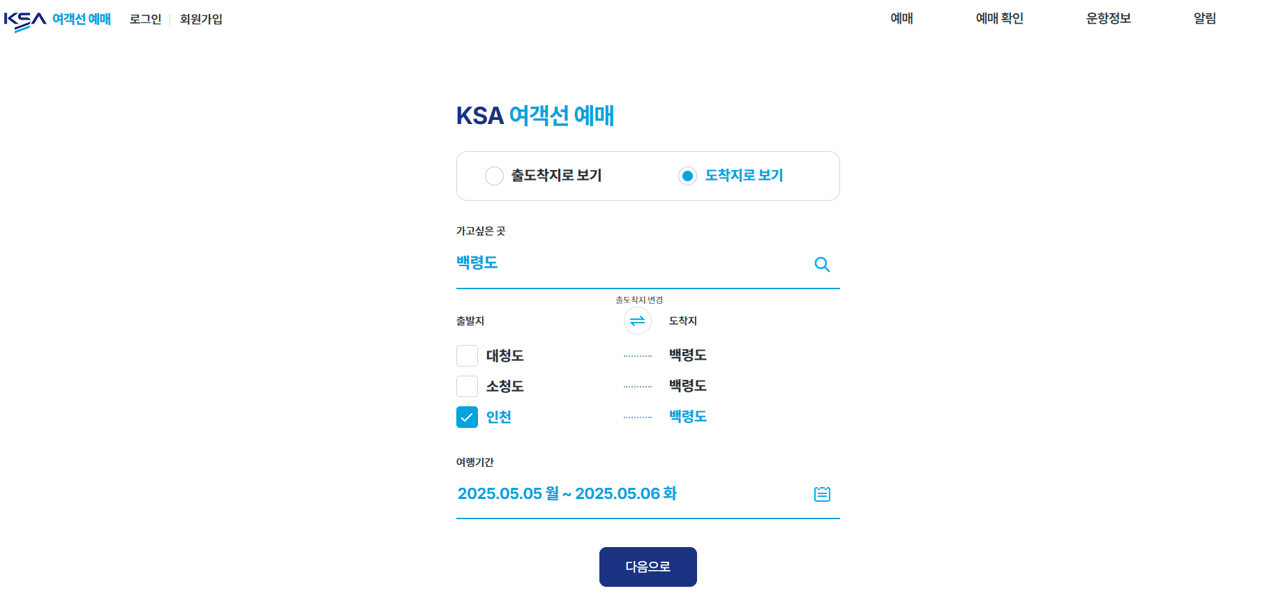 도착지로보기에서 백령도를 입력합니다