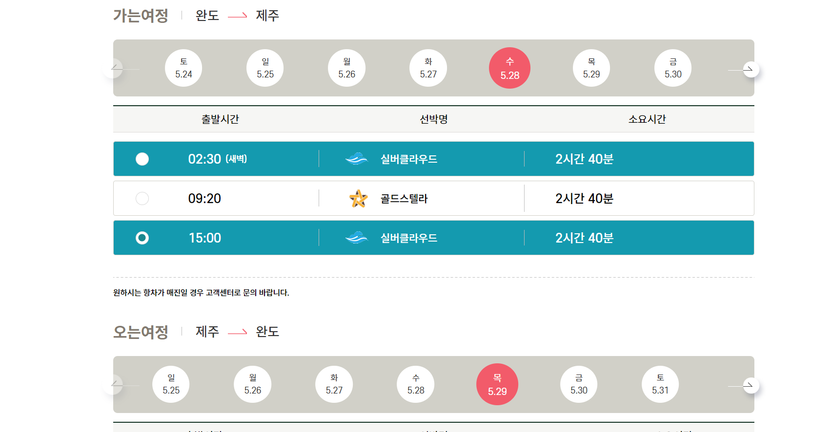 출발지(완도), 도착지(제주) 선택 후 날짜 및 선박 조회.