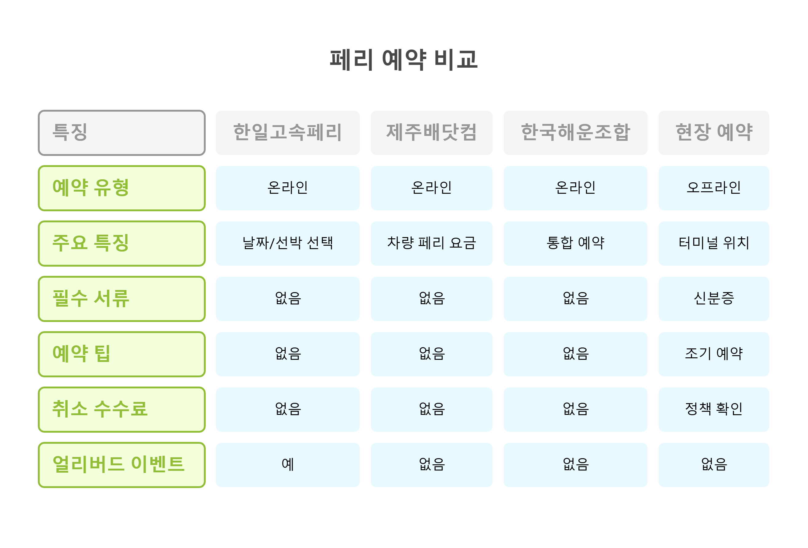 조기 예약: 성수기(여름, 연휴)에는 좌석과 차량 선적이 조기 마감되니 1~2주 전 예약 권장.