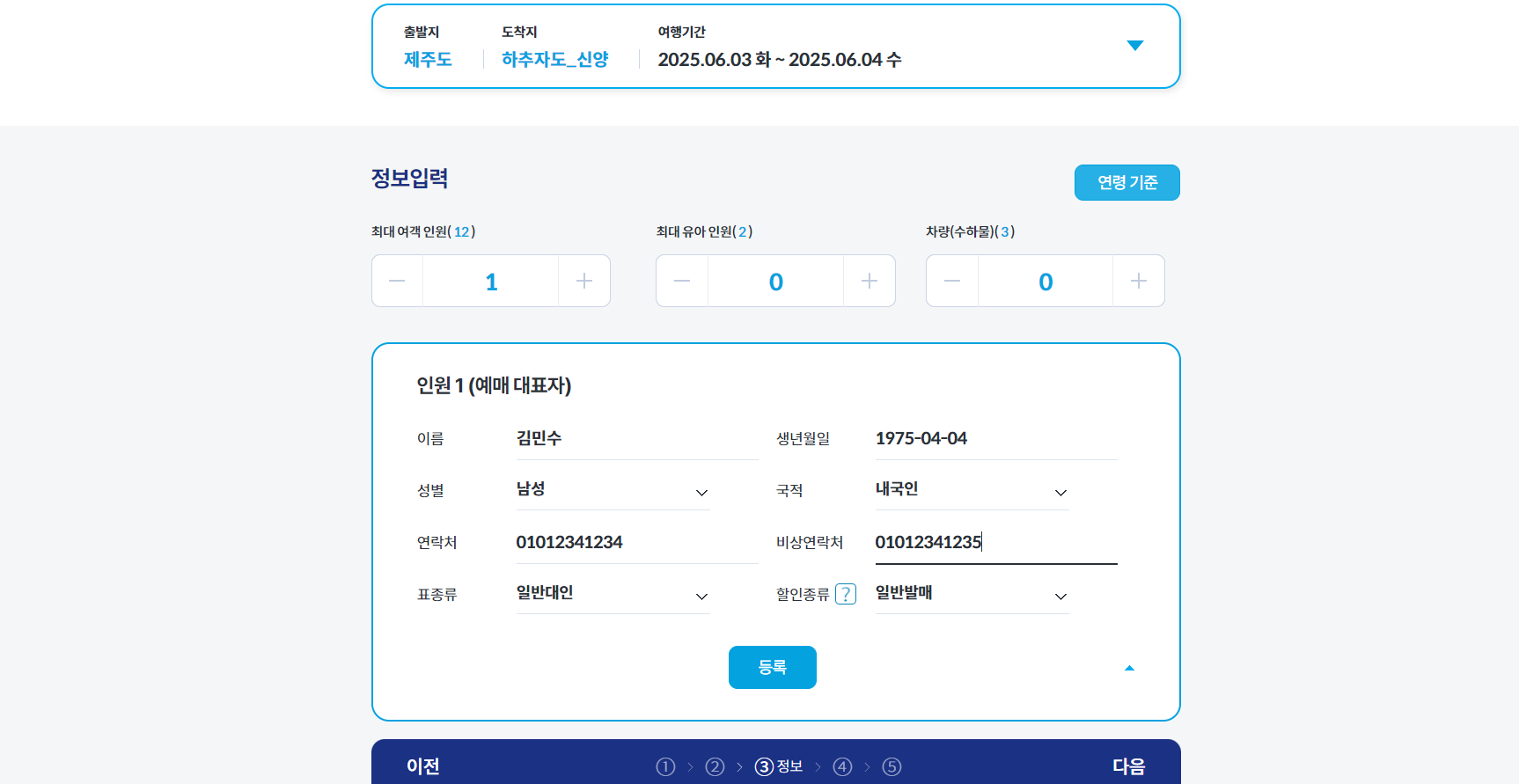 승선자 정보(이름, 생년월일, 연락처) 입력