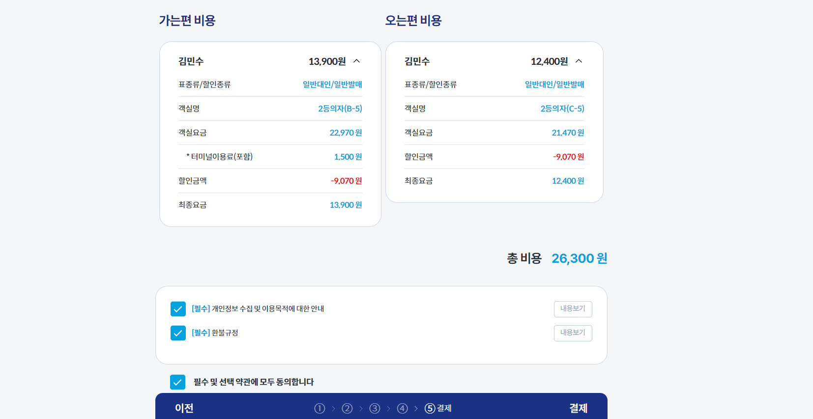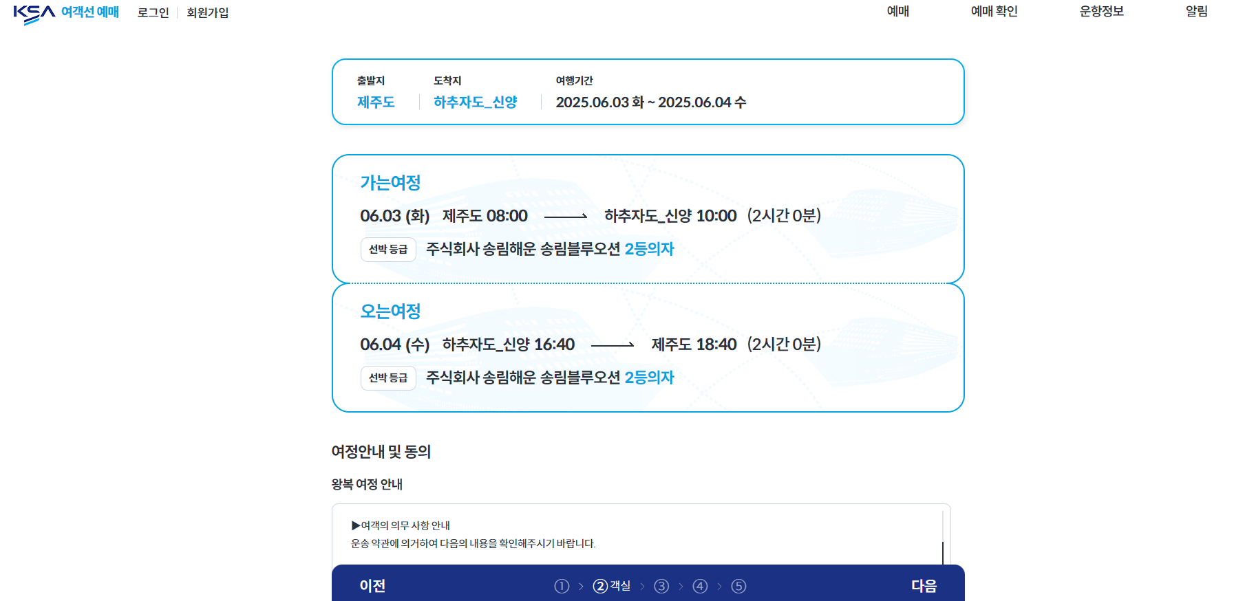 가는 여정과 오는 여정을 모두 선택해주어야 합니다