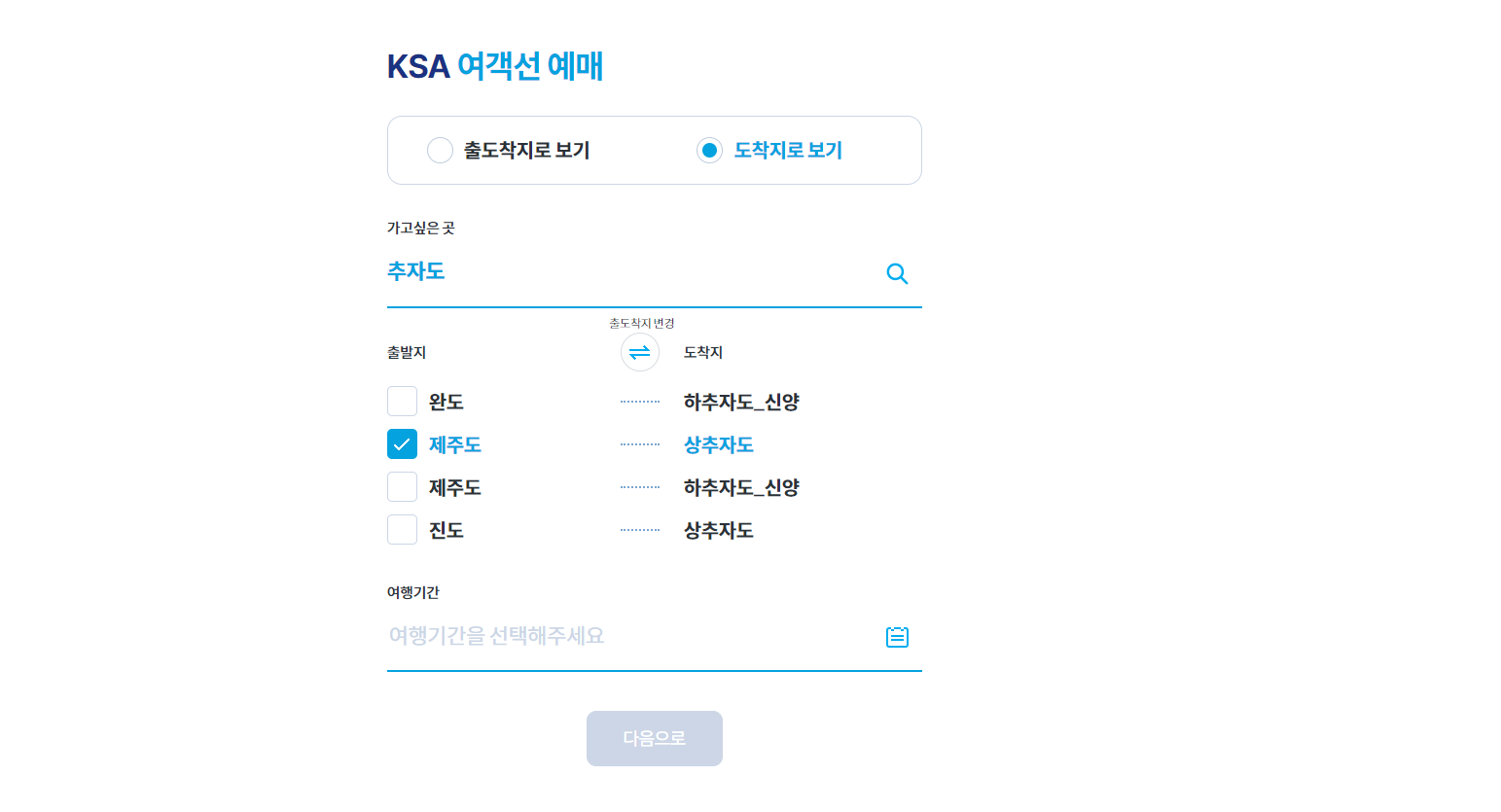 웹사이트 접속 후 출발지, 도착지(추자도), 날짜, 인원 입력
